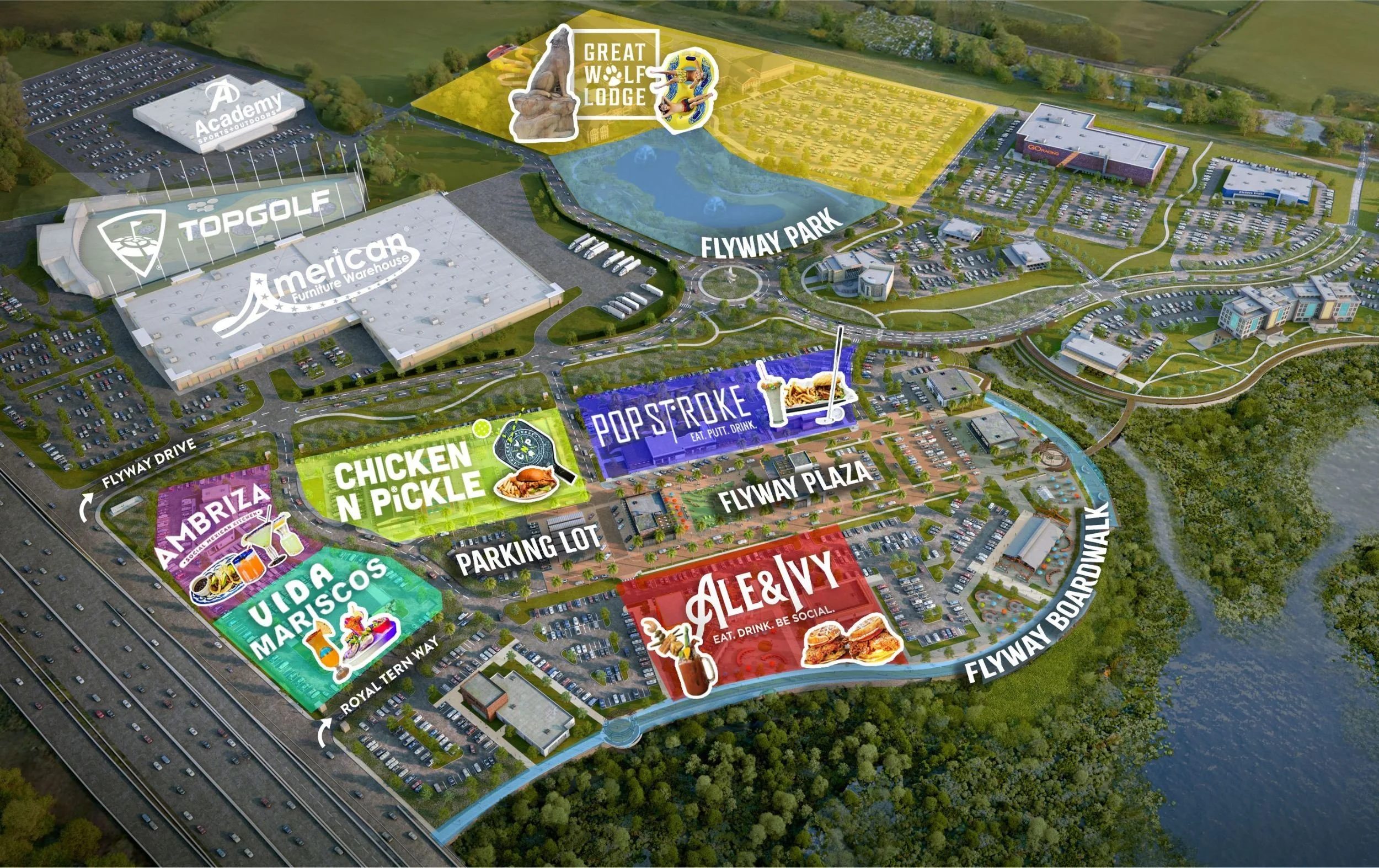 Flyway is a new 80+ acre destination development located along I-45 directly across from the SpringHill Suites, midway between downtown Houston and Galveston. Anchored by the region’s only Great Wolf Lodge indoor waterpark resort, which opened in August 2024, Flyway will feature top dining, entertainment, and recreation venues like Ambriza, Chicken N Pickle, and Popstroke, set within a walkable environment with a boardwalk and event lawn. With build-ready parcels available, Flyway is poised to attract unique businesses and become a premier entertainment hub for Texas and beyond once completed.